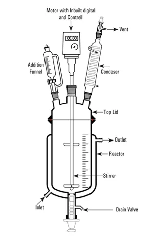 • Options: jacketed cooling/heating, vacuum pump, temperature sensors, additional ports for sampling or addition